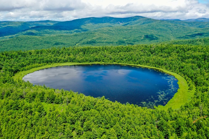 這是內(nèi)蒙古阿爾山國(guó)家森林公園內(nèi)的天池(2021年7月14日攝,無(wú)人機(jī)照片)。新華社記者 連振 攝