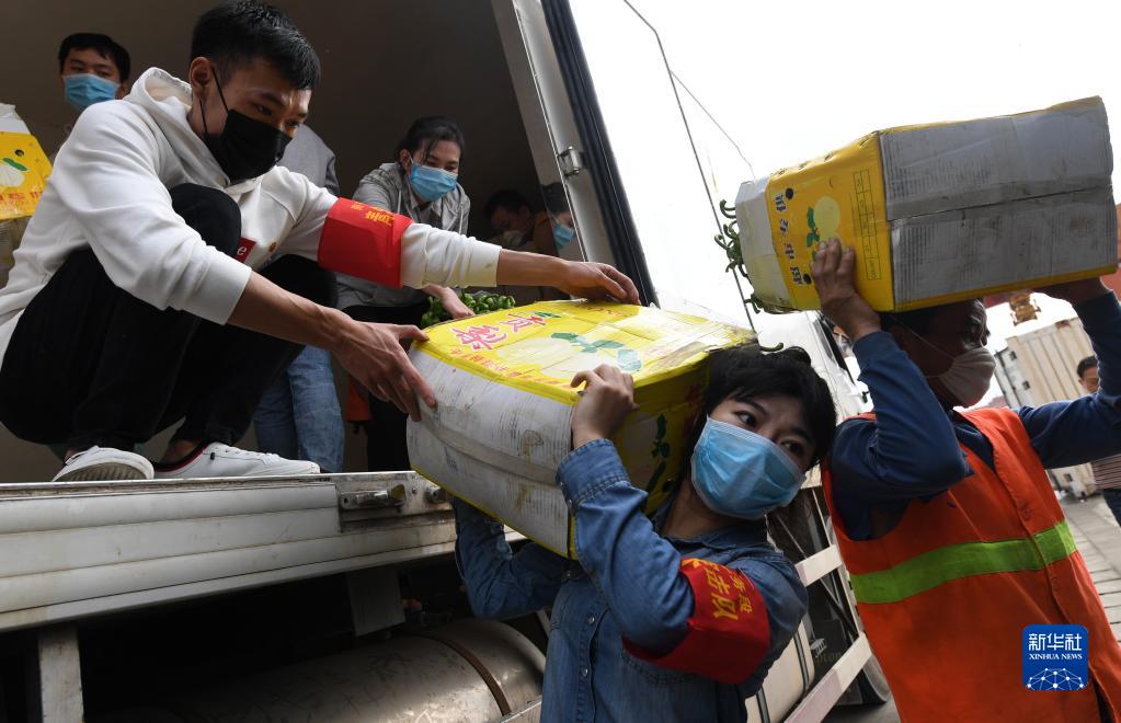 2020年3月3日,在廣西南寧國(guó)際鐵路港,南寧車務(wù)段“青年突擊隊(duì)”隊(duì)員黃瑩瑩(右二)在搬運(yùn)廣西馳援湖北物資。新華社記者 陸波岸 攝