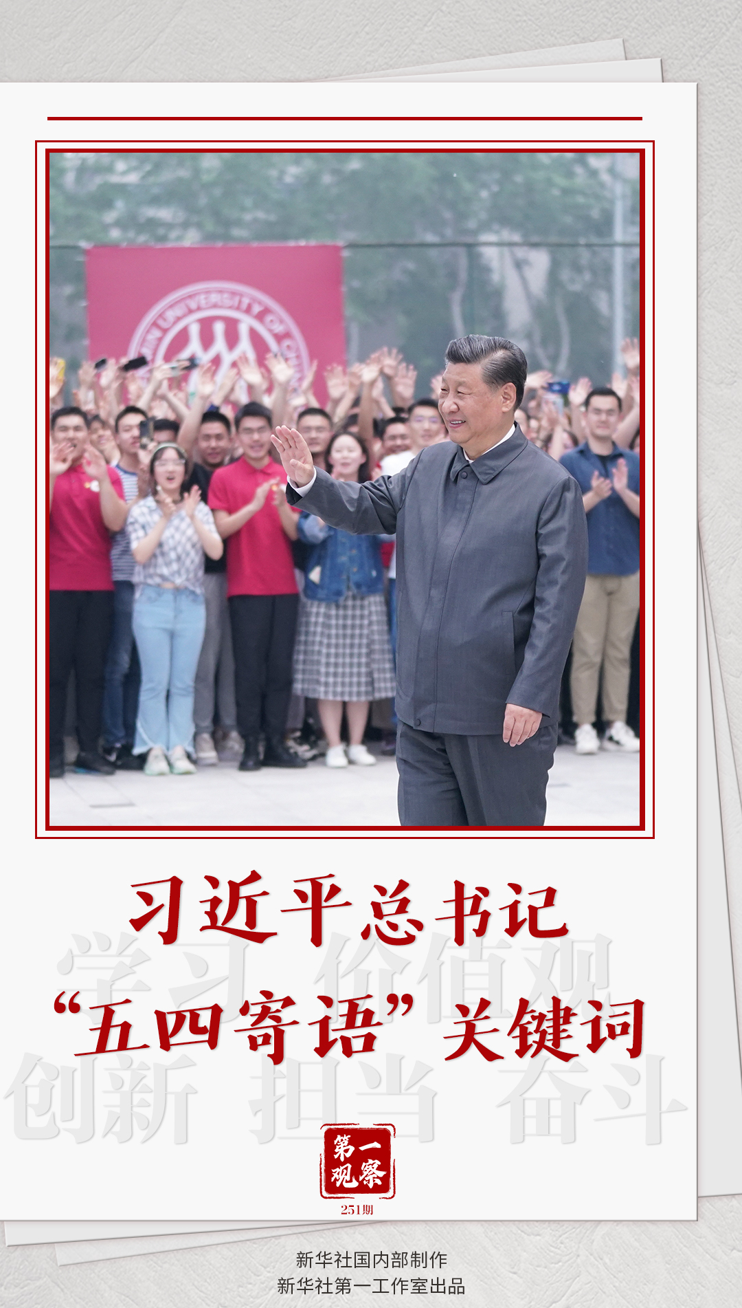 “五四運(yùn)動(dòng)以來的100年,是中國青年一代又一代接續(xù)奮斗、凱歌前行的100年,是中國青年用青春之我創(chuàng)造青春之中國、青春之民族的100年。”