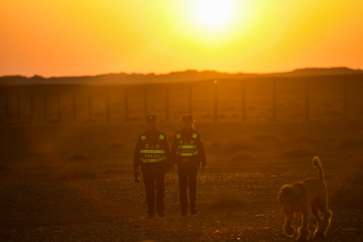 內(nèi)蒙古阿拉善邊境管理支隊(duì)銀根邊境派出所戍邊夫妻警務(wù)室的徐乃超和李文娜在邊境線附近巡邏(2022年4月18日攝)。新華社記者 彭源 攝
