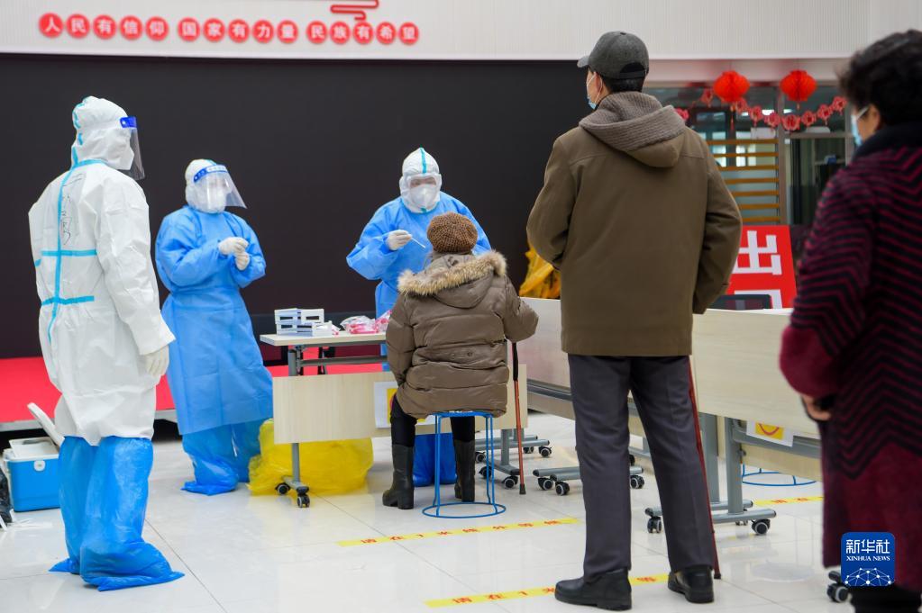 在內蒙古滿洲里市東山街道辦事處怡園社區(qū)府欣小區(qū)A區(qū)核酸采樣點,工作人員為居民做核酸采樣(2021年11月29日攝)。新華社記者 李志鵬 攝
