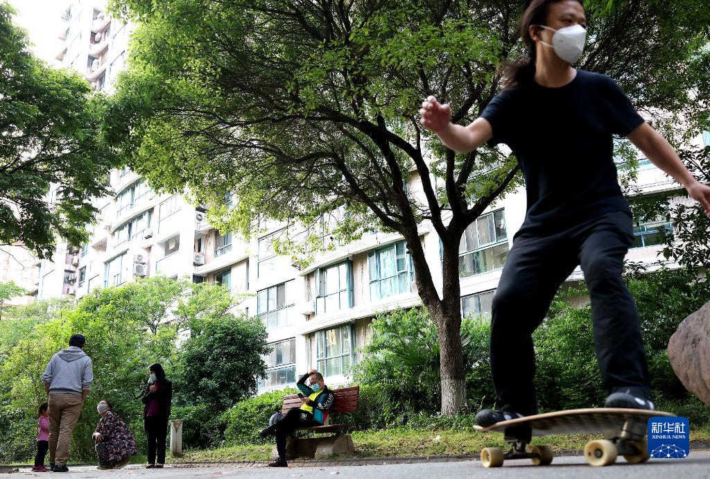 5月17日,市民在上海市普陀區(qū)的一個居民小區(qū)內享受休閑一刻。新華社記者 陳飛 攝
