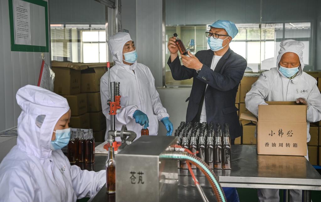 小韓峪村第一書記馮德全(右二)在小韓峪村小磨香油廠檢測香油品質。新華社記者陶明 攝