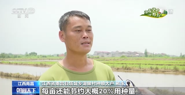 江西省南昌縣塔城鄉(xiāng)湖陂村種糧大戶 熊永:種子撒得均勻,每畝還能節(jié)約大概20%用種量,人工播種的話每天只能完成30畝地左右,使用無(wú)人機(jī)一天可以完成400多畝的播種,效率是人工工作的十倍。