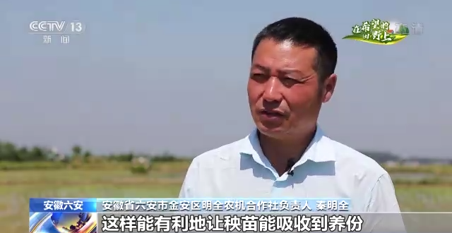 安徽省六安市金安區(qū)明全農(nóng)機(jī)合作社負(fù)責(zé)人 秦明全:這樣能有利地讓秧苗能吸收到養(yǎng)分,減少了肥料成本,每畝能減少40%以上,降低了農(nóng)業(yè)面源污染。我們現(xiàn)在種植全部都是綠色水稻。