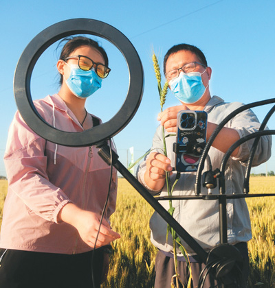 在山東省聊城市東昌府區(qū)閆寺街道周店村小麥良種繁育展示基地,負責(zé)技術(shù)的當?shù)厍嗄暝趯π←溒贩N進行直播推介。 |