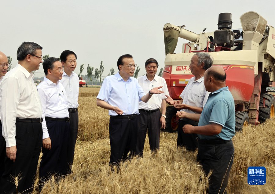 6月21日,中共中央政治局常委、國務院總理李克強在河北高碑店、涿州考察。這是李克強在高碑店方官鎮(zhèn)小麥地里,與種糧農(nóng)戶等交談。 新華社記者 劉衛(wèi)兵 攝