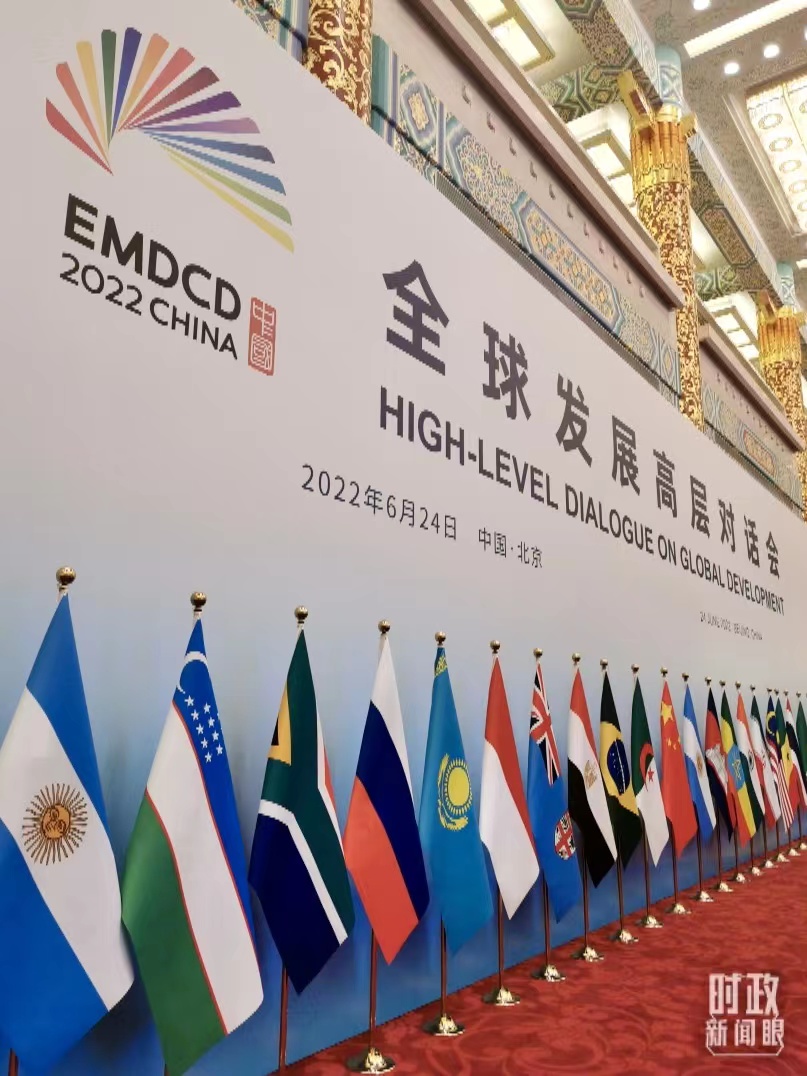 全球發(fā)展高層對(duì)話會(huì)的中方會(huì)場(chǎng),設(shè)在人民大會(huì)堂金色大廳。林立的參會(huì)國(guó)旗幟、紅色的地毯,映襯著會(huì)議的熱度。
