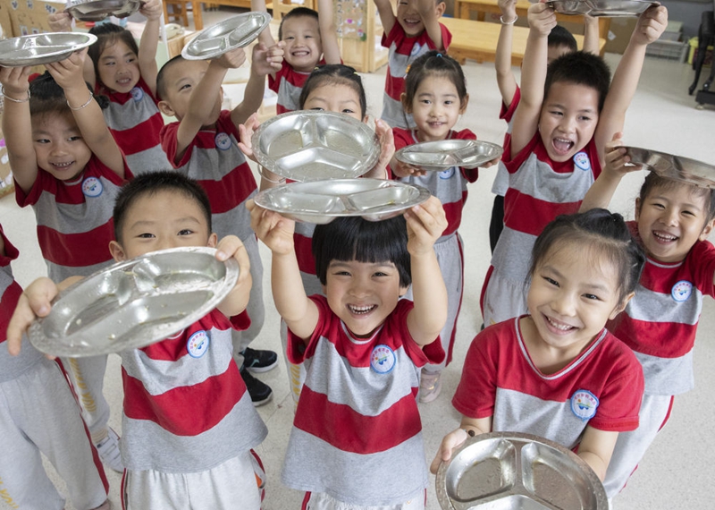 ↑浙江省諸暨市濱江幼兒園小朋友在午餐時(shí)比賽誰吃得最干凈(2021年10月14日攝)。