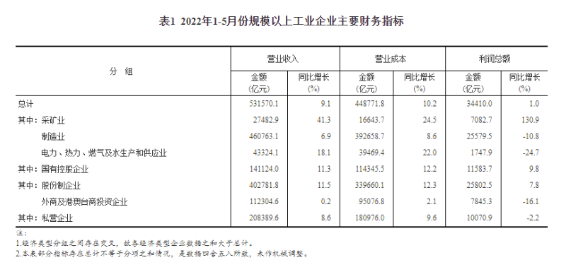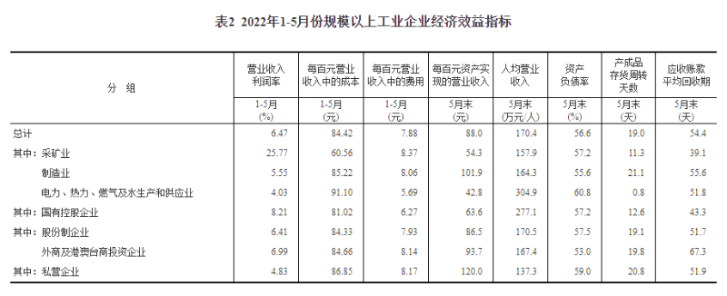 表1 2022年1-5月份規(guī)模以上工業(yè)企業(yè)主要財務(wù)指標(biāo)