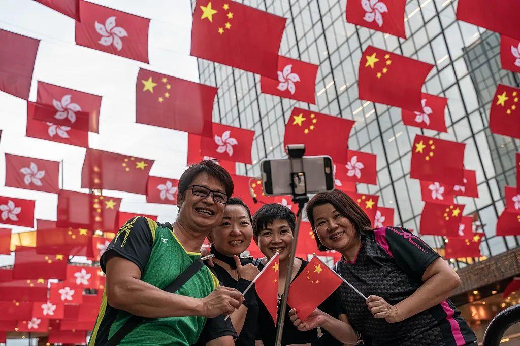 △2021年7月1日,香港市民在街頭揮舞五星紅旗,慶祝中國共產(chǎn)黨成立100周年及香港回歸祖國24周年。