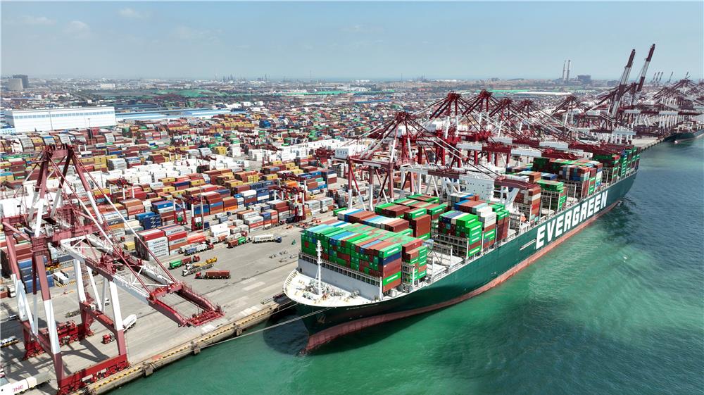 山東港口青島港前灣港區(qū),集裝箱貨輪在碼頭裝卸集裝箱(2022年6月15日攝,無(wú)人機(jī)照片)。新華社記者 李紫恒 攝