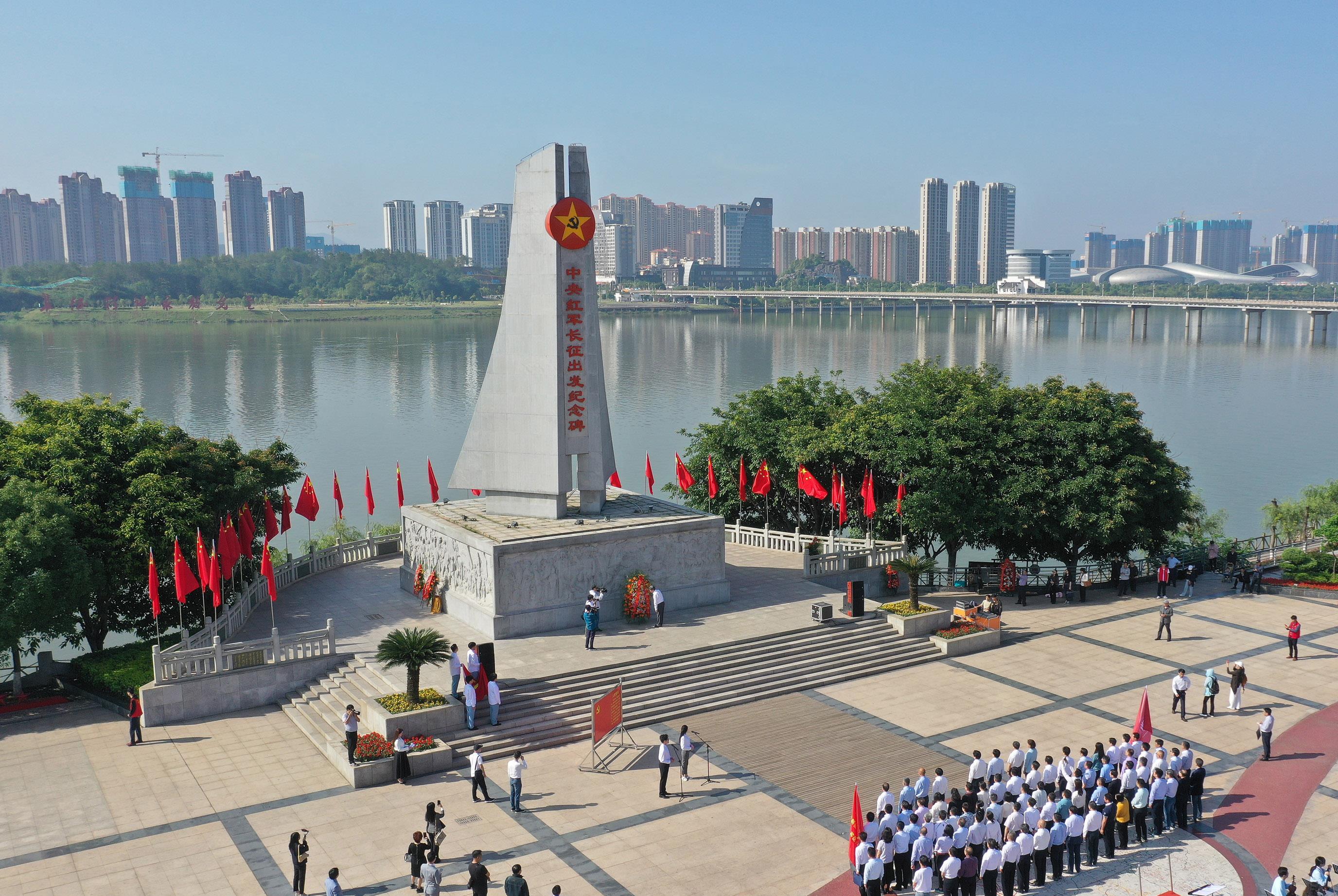 人們?cè)诮魇∮诙伎h中央紅軍長(zhǎng)征出發(fā)紀(jì)念碑前參加紀(jì)念活動(dòng)(2021年4月30日攝,無(wú)人機(jī)照片)。新華社記者 萬(wàn)象 攝