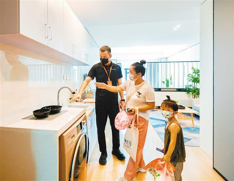 簡單介紹后,工作人員帶著劉女士參觀了位于6樓的樣板間。“真寬敞夠亮堂!”房門打開的一瞬間,劉女士忍不住感嘆道。這套房源有70多平方米,裝修簡約時尚、充滿年輕氣息,洗衣機、冰箱、空調(diào)等設(shè)施一應(yīng)俱全,家具陳列干凈整潔。“真沒想到條件這么好,房間內(nèi)的裝修和家具都是我喜歡的樣子。尤其是房間里有獨立的衛(wèi)浴,住起來會很方便。”劉女士說,自己對房源很滿意。參觀結(jié)束后,劉女士立即向工作人員詳細詢問租住流程。