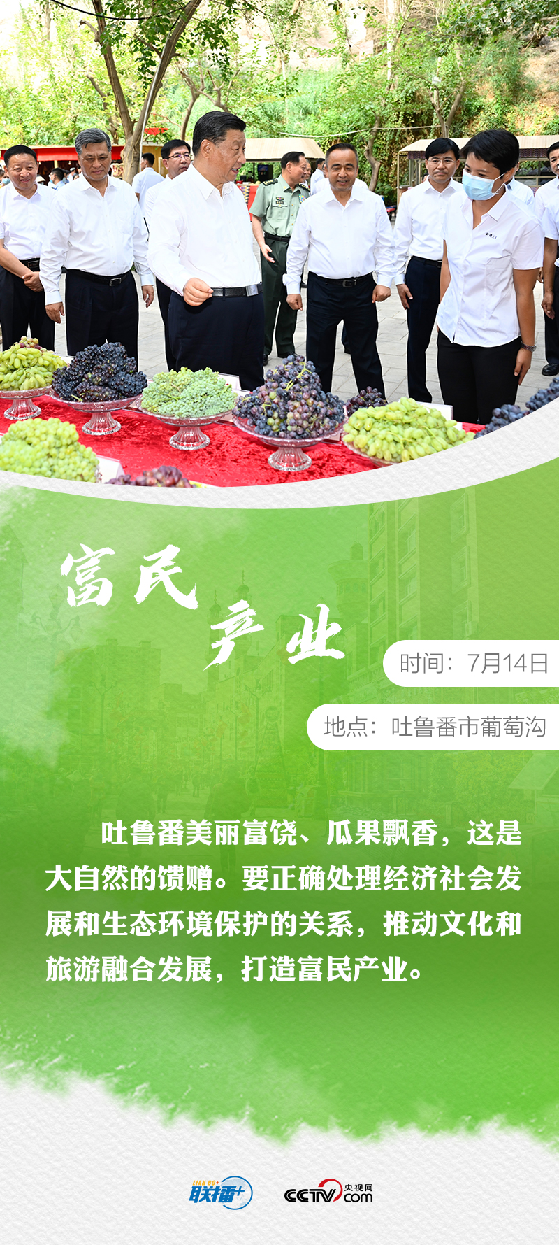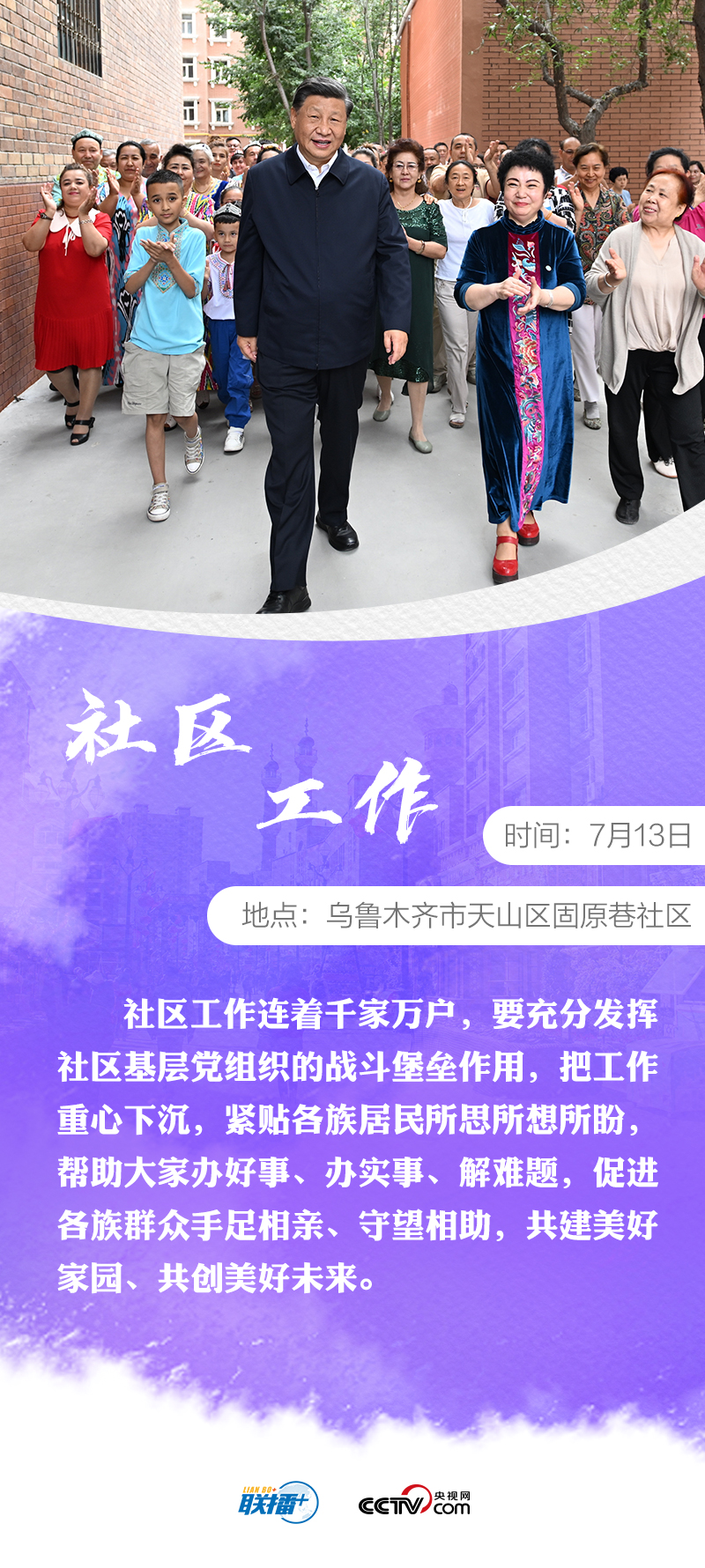 7月12日至15日,習(xí)近平總書(shū)記時(shí)隔八年再次考察新疆。他先后來(lái)到烏魯木齊、石河子、吐魯番等地,深入學(xué)校、國(guó)際陸港區(qū)、社區(qū)、博物館、農(nóng)村和新疆生產(chǎn)建設(shè)兵團(tuán)等進(jìn)行調(diào)研。