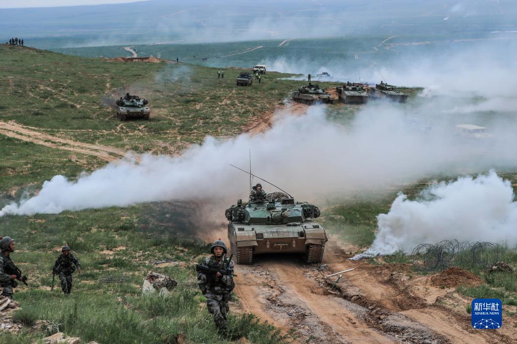 “跨越-2016·朱日和A”演習(xí)進(jìn)入實(shí)兵對(duì)抗陣地進(jìn)攻戰(zhàn),這是紅藍(lán)雙方首場(chǎng)對(duì)抗中紅軍步兵和坦克協(xié)同(2016年7月19日攝)。新華社發(fā)(王佳寅 攝)