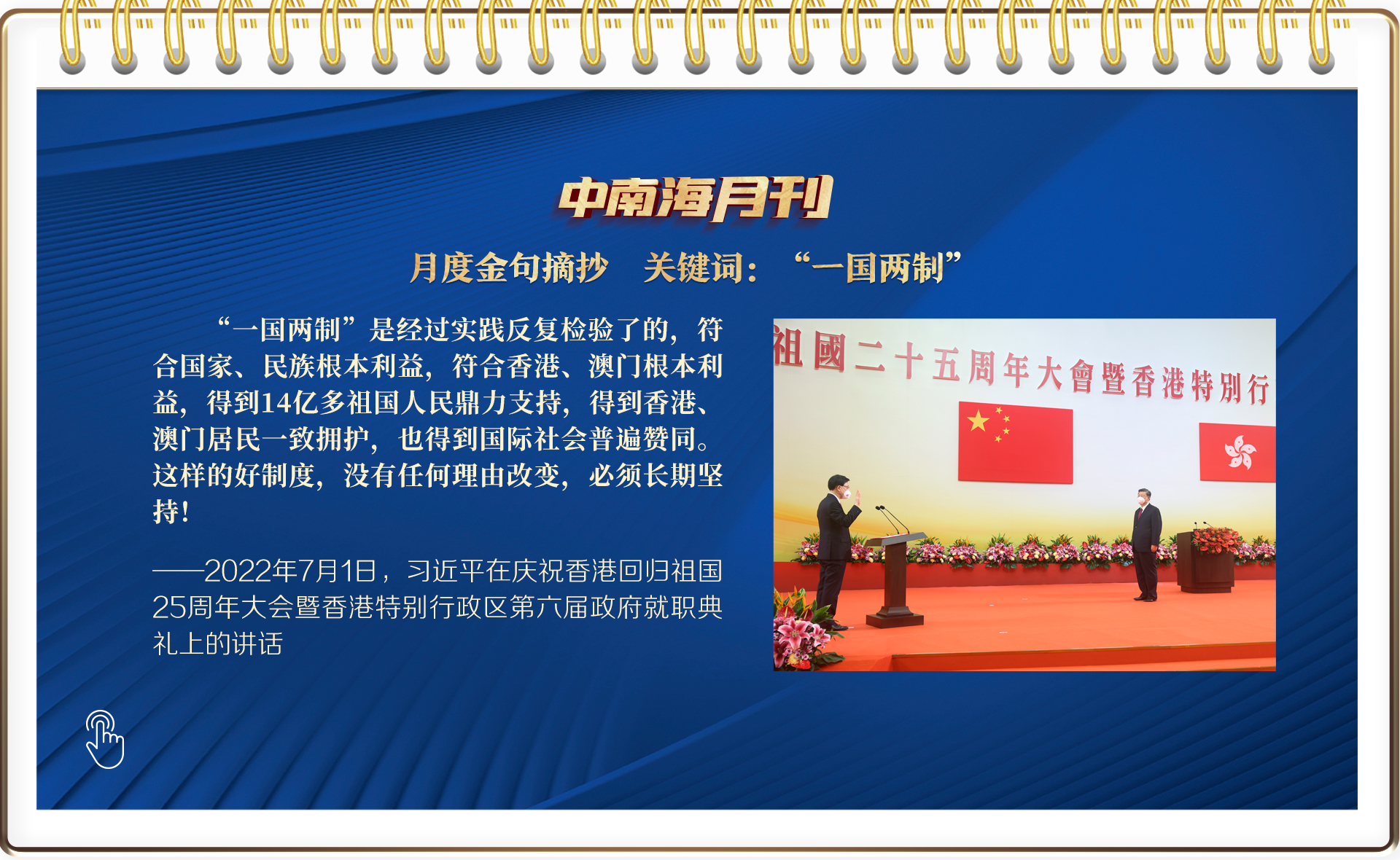 7月1日上午,站在25年前中英兩國(guó)政府香港政權(quán)交接儀式的舉行地——香港會(huì)展中心,習(xí)主席言語(yǔ)鏗鏘:“‘一國(guó)兩制’是經(jīng)過實(shí)踐反復(fù)檢驗(yàn)了的,符合國(guó)家、民族根本利益,符合香港、澳門根本利益。”“這樣的好制度,沒有任何理由改變,必須長(zhǎng)期堅(jiān)持。”“把香港特別行政區(qū)管治權(quán)牢牢掌握在愛國(guó)者手中,這是保證香港長(zhǎng)治久安的必然要求,任何時(shí)候都不能動(dòng)搖。”