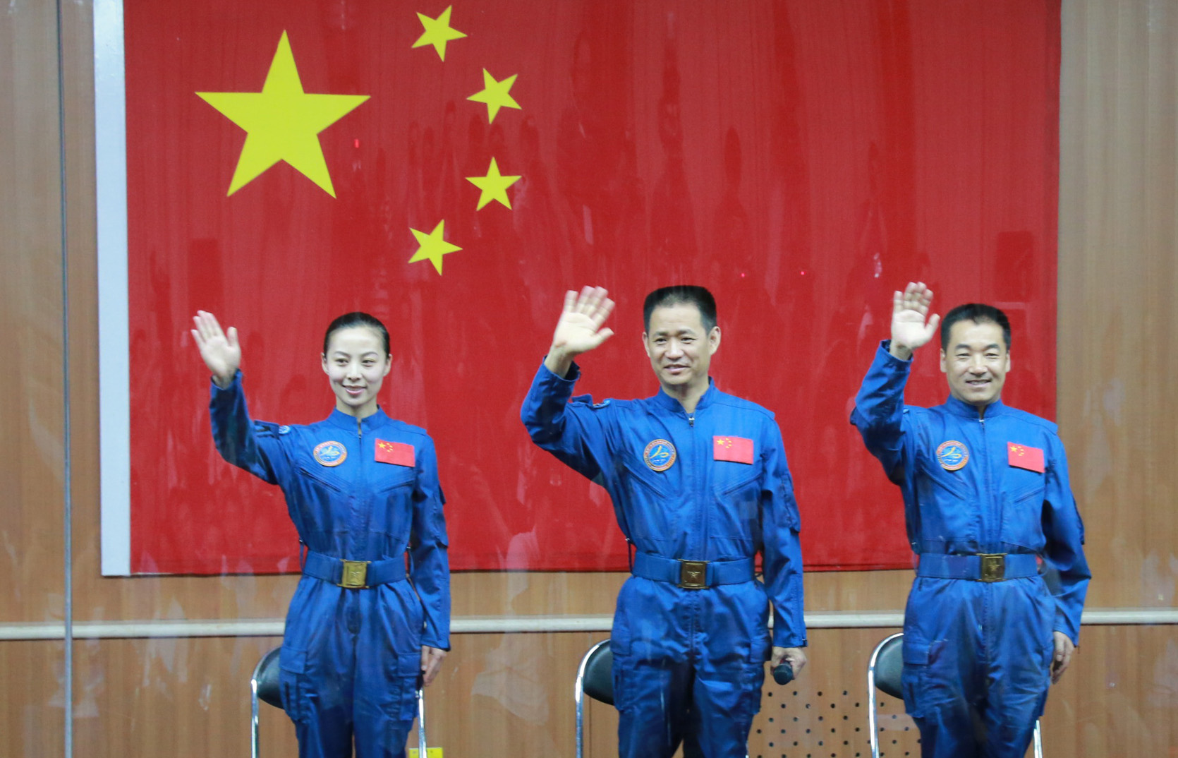 2013年6月10日,天宮一號與神舟十號載人飛行任務(wù)航天員在酒泉衛(wèi)星發(fā)射中心同記者見面。新華社記者 李剛 攝