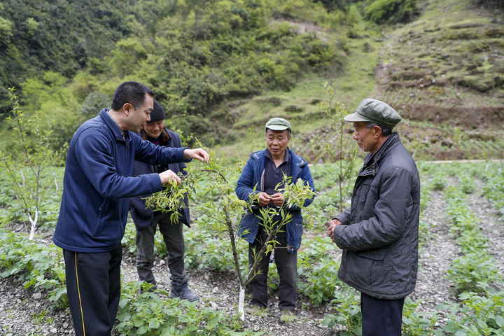 在重慶市巫溪縣天元鄉(xiāng)萬春村,專家團隊成員王大平(左一)對村民進行冬桃樹苗整形壓枝培訓(xùn)(2020年4月23日攝)。新華社記者 黃偉 攝