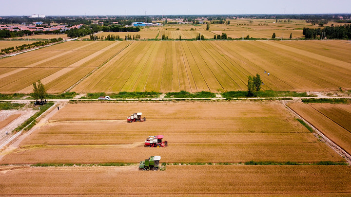 2022年6月7日,在山東省惠民縣桑落墅鎮(zhèn),農民駕駛農機收獲小麥(無人機照片)。新華社記者 郭緒雷 攝