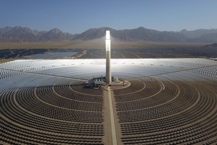 這是2022年6月8日在海西蒙古族藏族自治州德令哈市光伏(光熱)產業(yè)園拍攝的青海中控德令哈50兆瓦光熱電站(無人機照片)。新華社記者 范培珅 攝