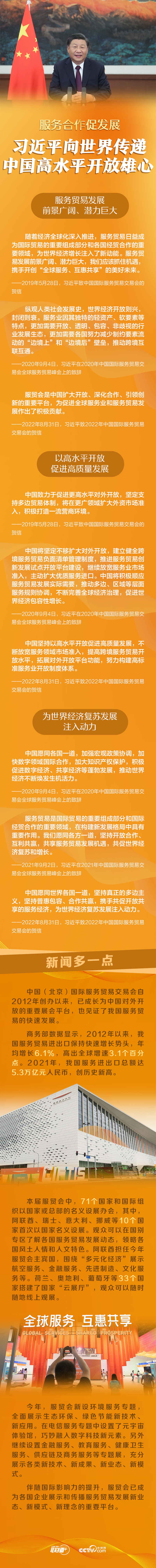 8月31日,國家主席習(xí)近平向2022年中國國際服務(wù)貿(mào)易交易會(huì)致賀信。多年來,習(xí)近平主席高度關(guān)注中國服務(wù)貿(mào)易發(fā)展,提出多項(xiàng)舉措,持續(xù)推動(dòng)中國實(shí)施更大范圍、更寬領(lǐng)域、更深層次的對外開放?! ?/p>