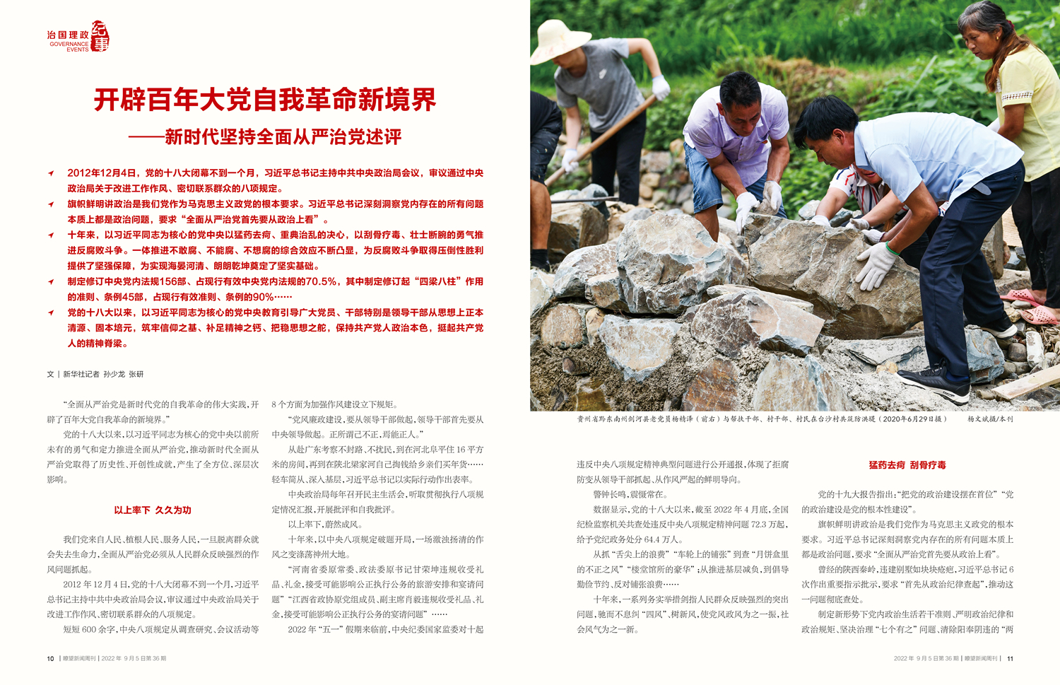 貴州省黔東南州劍河縣老黨員楊精澤(前右)與幫扶干部、村干部、村民在臺沙村共筑防洪堤(2020年6月29日攝) 楊文斌攝/本刊