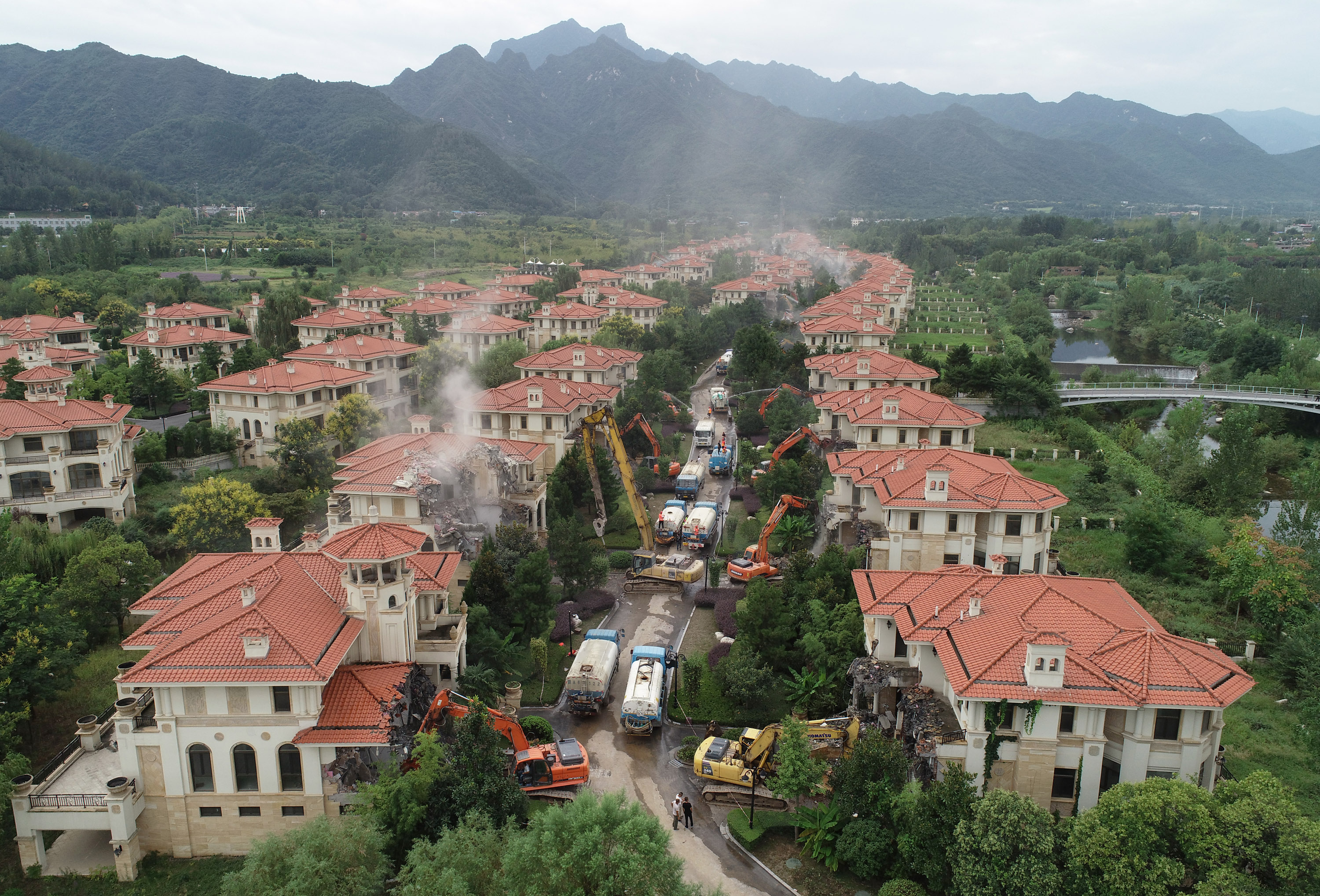 大型機(jī)械在陜西省西安市長(zhǎng)安區(qū)秦嶺違建別墅群“群賢別業(yè)”內(nèi)進(jìn)行拆除工作(2018年9月6日攝,無(wú)人機(jī)照片)。新華社記者 邵瑞 攝