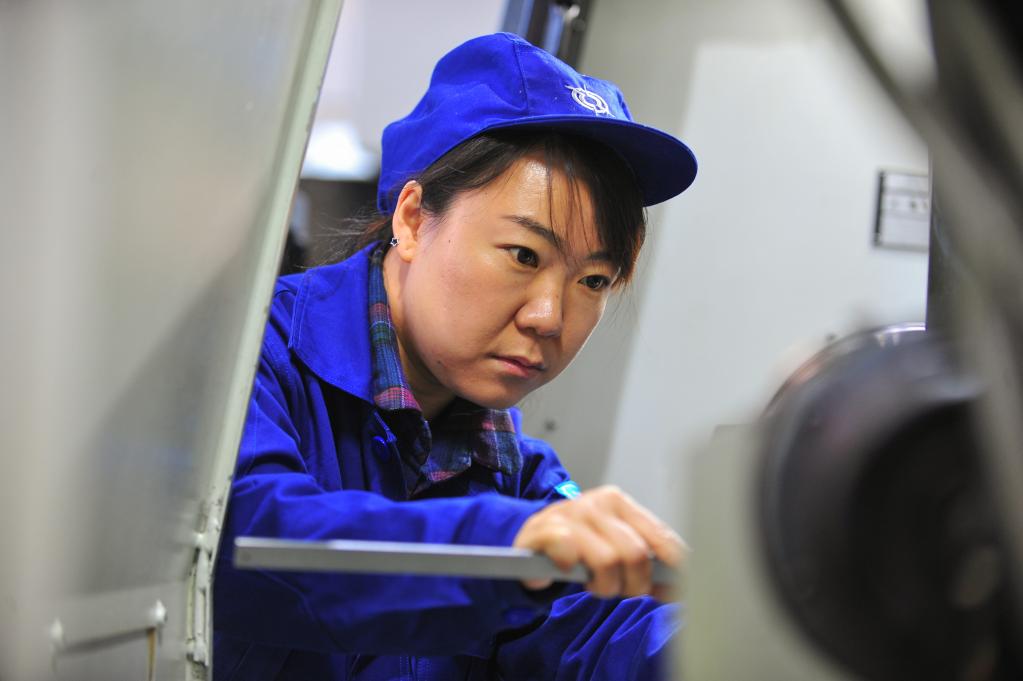 在中國兵器內(nèi)蒙古第一機(jī)械集團(tuán)有限公司第四分公司,趙晶為數(shù)控機(jī)床更換精加工所用的刀片(2018年3月5日攝)。新華社記者 彭源 攝