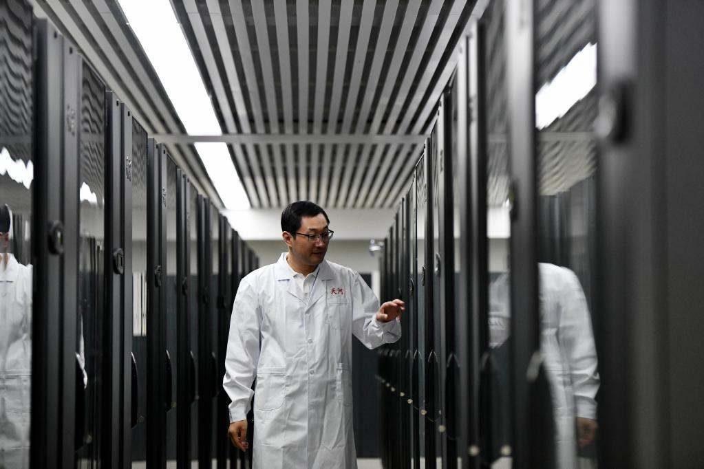 在國家超級計算天津中心“天河一號”機(jī)房內(nèi),孟祥飛在查看設(shè)備運(yùn)行狀態(tài)(2021年5月27日攝)。新華社記者 趙子碩 攝