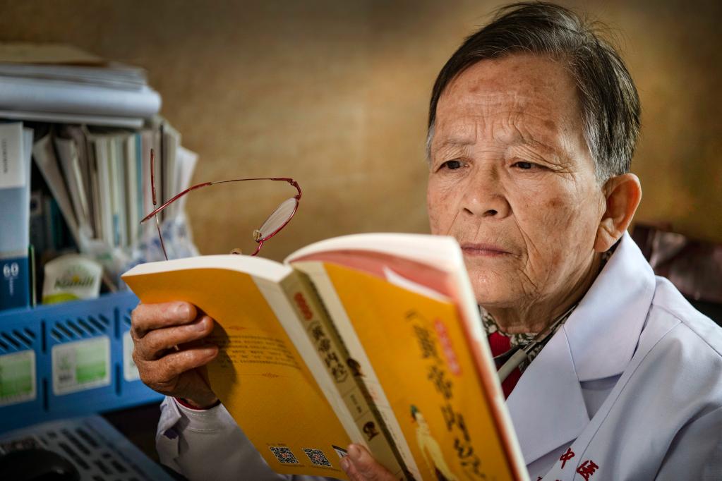在陜西佳縣中醫(yī)院門診義診的路生梅,沒有病人時堅持看書學(xué)習(xí)(2020年4月8日攝)。新華社記者 陶明 攝