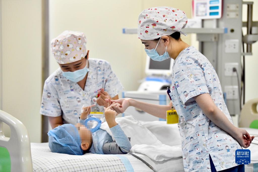 在山東省棗莊市婦幼保健院兒童ICU病房,醫(yī)護(hù)人員為完成靶向治療藥物諾西那生鈉的4歲脊髓性肌萎縮癥患兒加油鼓勁(2022年1月1日攝)。諾西那生鈉注射液是我國(guó)首個(gè)獲批治療脊髓性肌萎縮癥的進(jìn)口藥物,2019年進(jìn)入中國(guó)市場(chǎng)時(shí),每針價(jià)格近70萬元。在2021年國(guó)家醫(yī)保目錄藥品談判中,以3.3萬元每針的價(jià)格進(jìn)入新版醫(yī)保藥品目錄。新華社記者 郭緒雷 攝