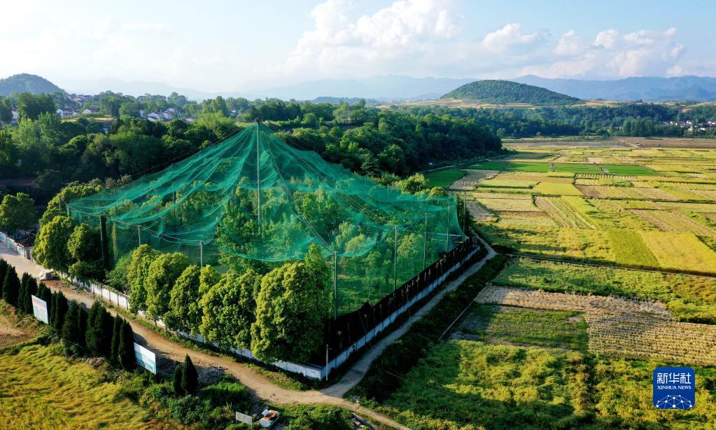 位于漢中市洋縣的陜西朱鹮人工繁育中心放飛大籠(2021年5月12日攝,無(wú)人機(jī)照片)。新華社記者 陶明 攝