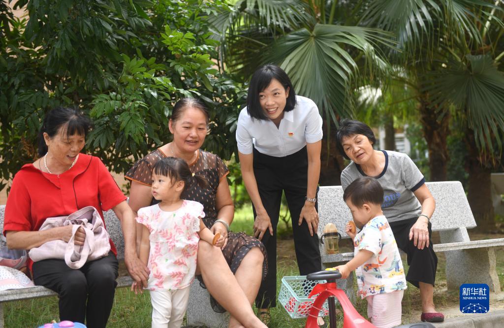二十大代表、廣東省佛山市禪城區(qū)古灶村黨委書(shū)記、村委會(huì)主任陸秀興(右三)和村民在一起聊天(2022年9月7日攝)。新華社記者 盧漢欣 攝