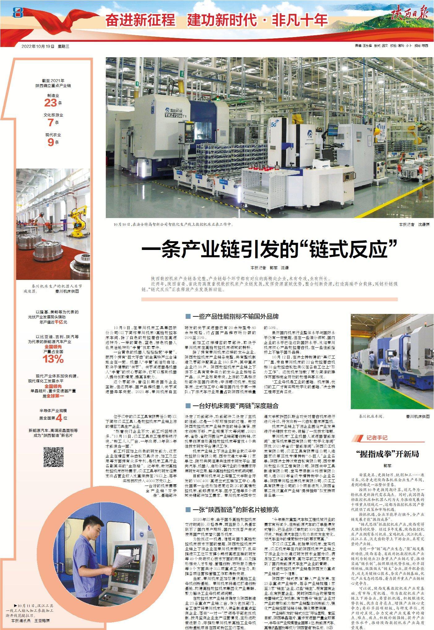 近兩年,陜西省委、省政府高度重視數(shù)控機床產(chǎn)業(yè)鏈發(fā)展,發(fā)揮資源稟賦優(yōu)勢,整合創(chuàng)新資源,打造高端平臺載體,延鏈補鏈強鏈。“鏈式反應”正在釋放產(chǎn)業(yè)發(fā)展新動能。