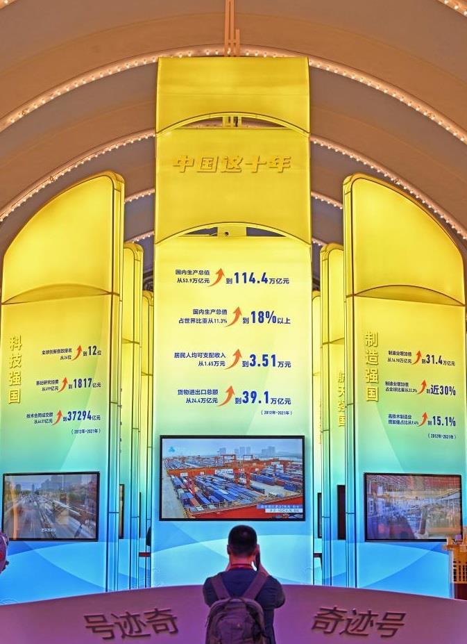 新時(shí)代10年,我國經(jīng)濟(jì)實(shí)力實(shí)現(xiàn)歷史性躍升,國內(nèi)生產(chǎn)總值從54萬億元增長到114萬億元,經(jīng)濟(jì)總量占世界經(jīng)濟(jì)的比重達(dá)18.5%,提高7.2個(gè)百分點(diǎn),穩(wěn)居世界第二位;人均國內(nèi)生產(chǎn)總值從39800元增加到81000元。