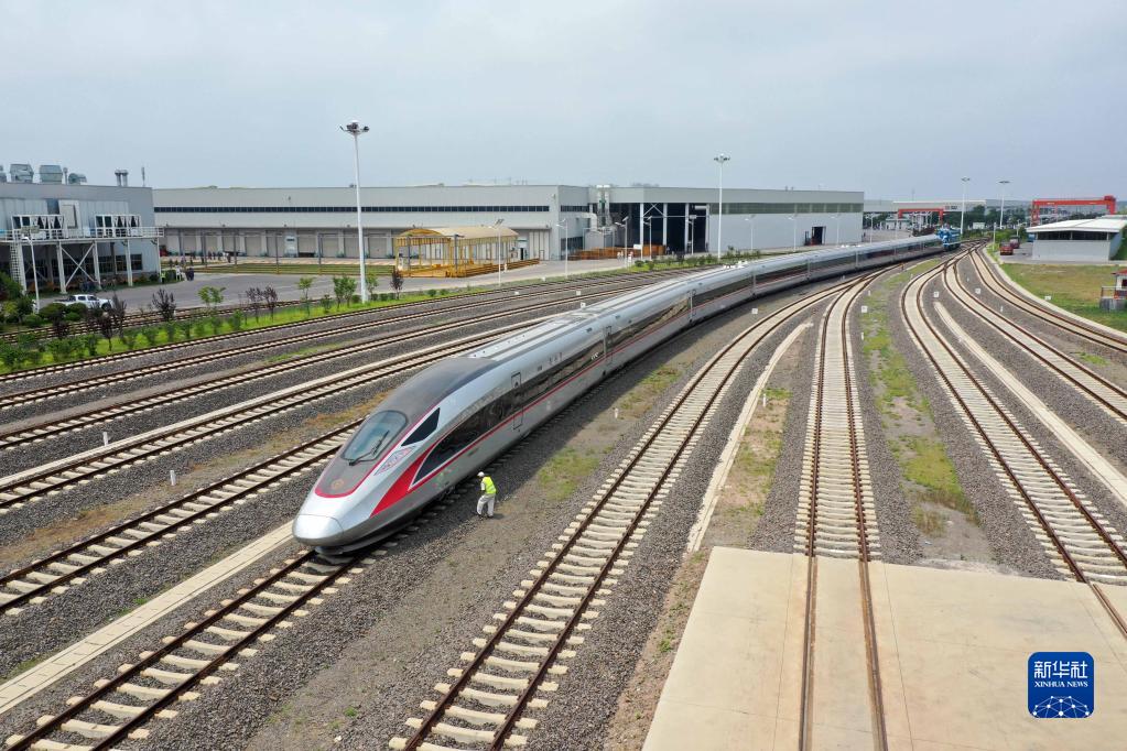 在位于山東青島的中車四方股份公司,一輛復(fù)興號列車正在出廠(2021年7月1日攝)。新華社發(fā)