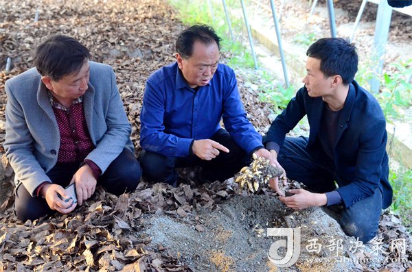 10月18日,伍家壩村第一書(shū)記唐賢斌(中)正在天麻繁育基地查看零代天麻種子生長(zhǎng)情況。