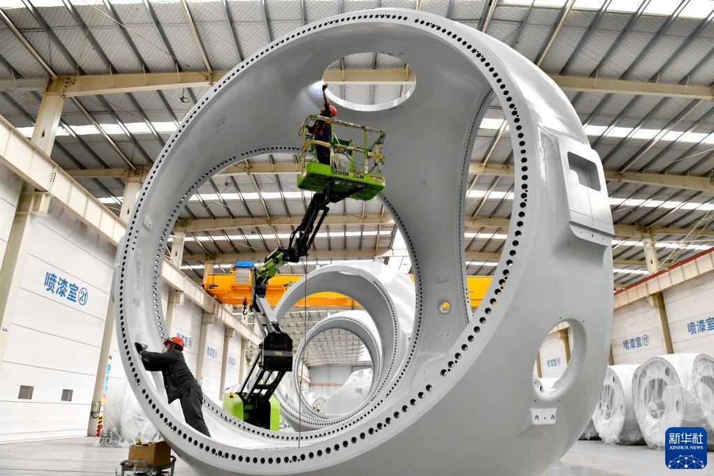 在山東省惠民縣風(fēng)電裝備產(chǎn)業(yè)基地涂裝車間,工作人員對風(fēng)電輪轂進(jìn)行涂裝(2022年6月7日攝)。新華社記者 郭緒雷 攝