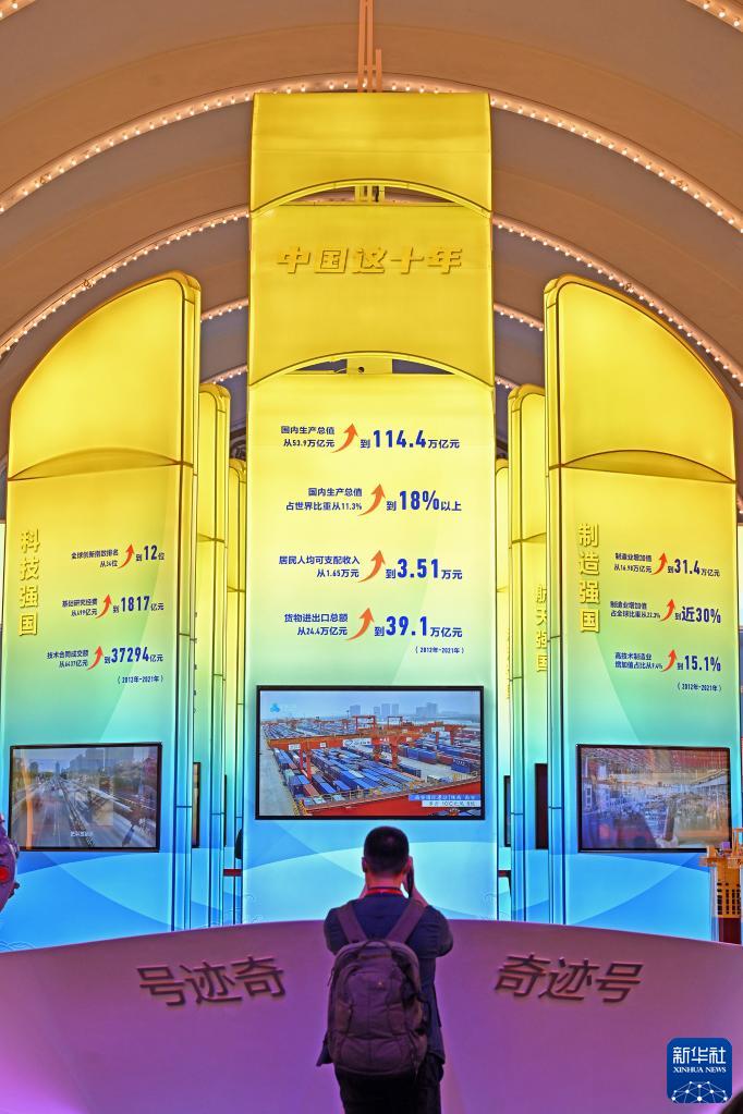 觀眾在“奮進(jìn)新時(shí)代”主題成就展中央綜合展區(qū)內(nèi)拍攝中國經(jīng)濟(jì)“奇跡號(hào)”巨輪模型(2022年10月8日攝)。新華社記者 李鑫 攝