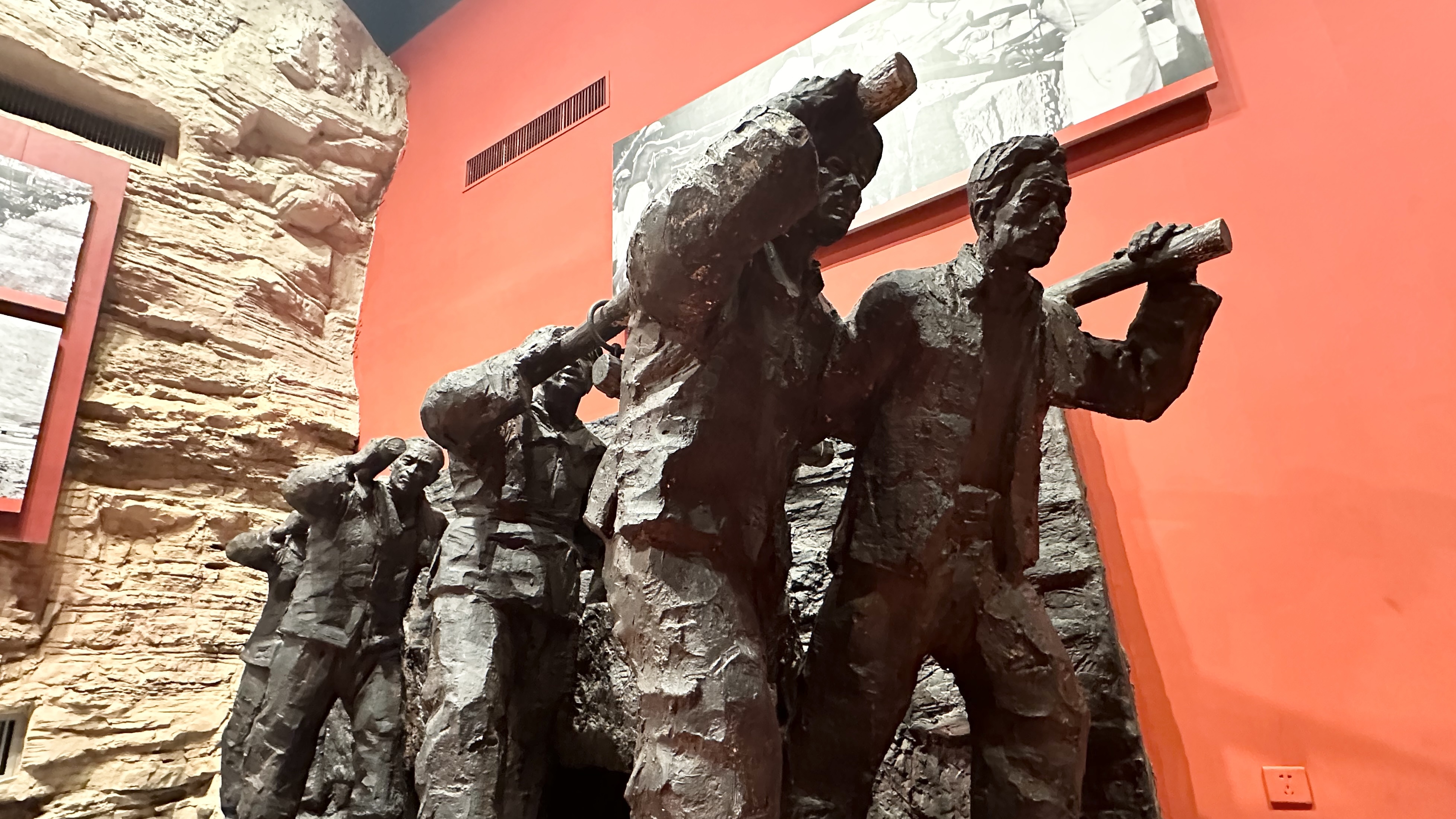 △紅旗渠紀(jì)念館,重現(xiàn)當(dāng)年修建場景的雕塑。(總臺央視記者范一鳴拍攝)