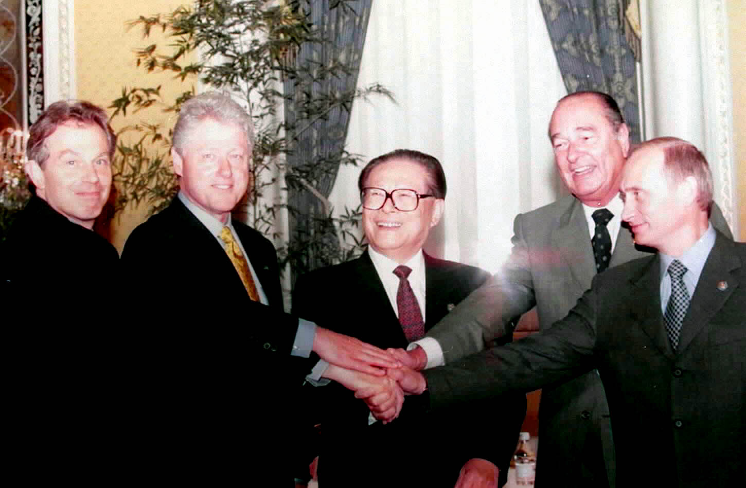 2000年9月7日,由中國倡議的聯(lián)合國安理會(huì)五個(gè)常任理事國首腦會(huì)議在紐約舉行。江澤民同志(中)同法國總統(tǒng)希拉克(右二)、俄羅斯總統(tǒng)普京(右一)、英國首相布萊爾(左一)、美國總統(tǒng)克林頓(左二)握手合影。新華社發(fā)