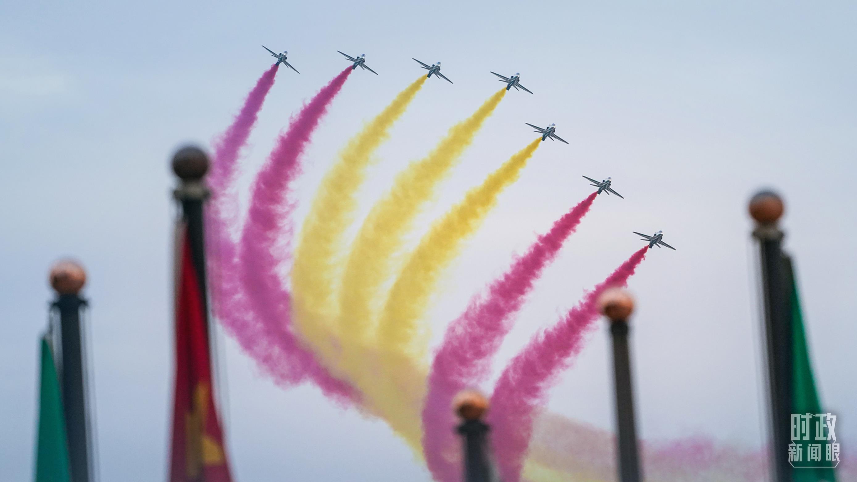 △沙特禮賓護(hù)衛(wèi)機(jī)在空中拉出象征中國國旗的紅黃兩色彩帶。(總臺(tái)國廣記者李晉拍攝)