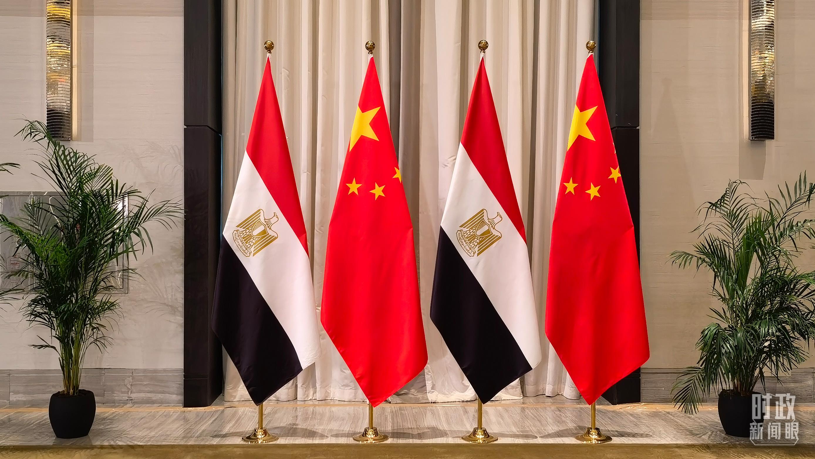 △會(huì)見現(xiàn)場的中埃兩國國旗。(總臺(tái)央視記者韓銳拍攝)
