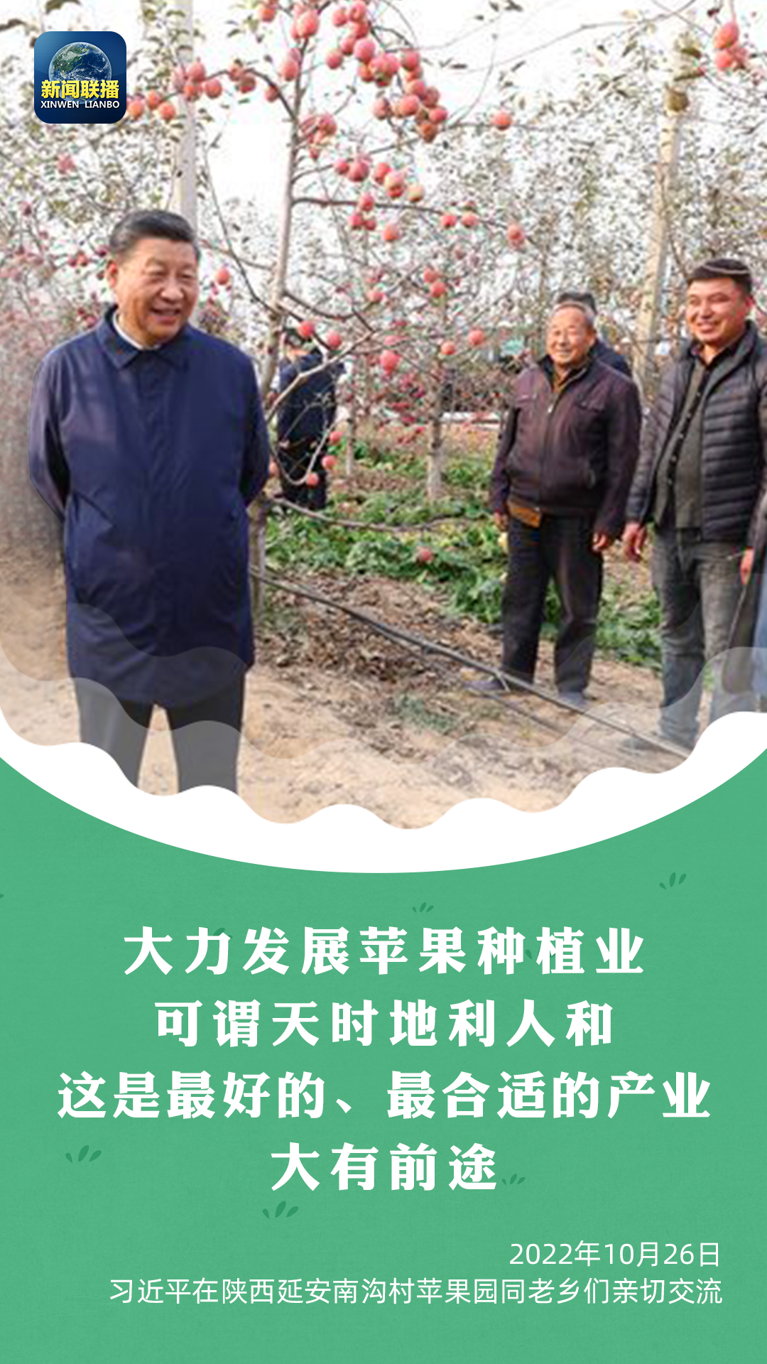 考察當(dāng)天,得知南溝村滴灌技術(shù)、矮化種植技術(shù)等不斷發(fā)展,而且蘋果不愁銷路,總書記高興地說:“大力發(fā)展蘋果種植業(yè)可謂天時地利人和,這是最好的、最合適的產(chǎn)業(yè),大有前途。”