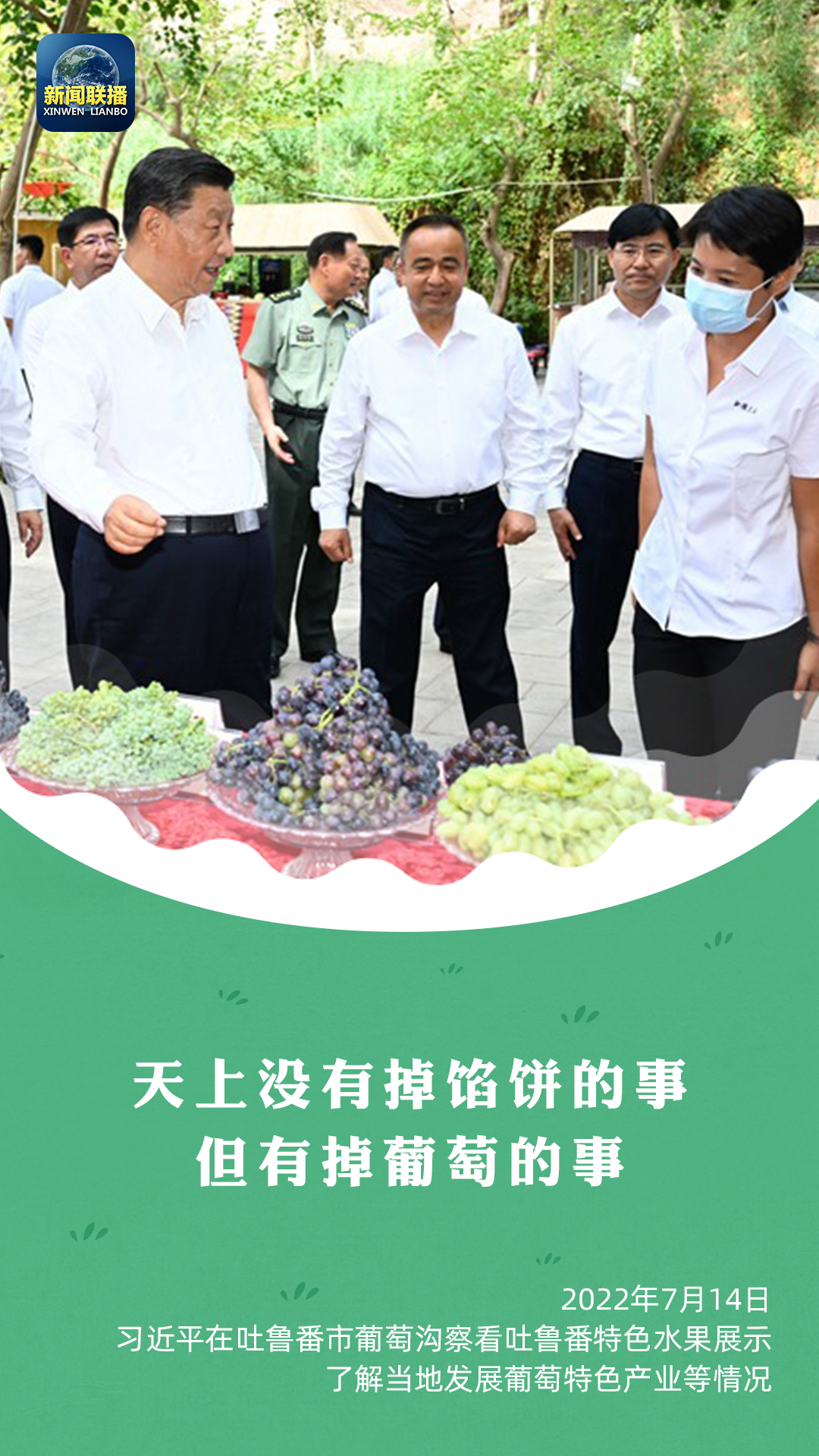 “多么富饒的一個地方,瓜果飄香。這是大自然的饋贈。”總書記風(fēng)趣地說,“天上沒有掉餡餅的事,但有掉葡萄的事。”總書記還強調(diào),要推動文化和旅游融合發(fā)展,打造富民產(chǎn)業(yè)。