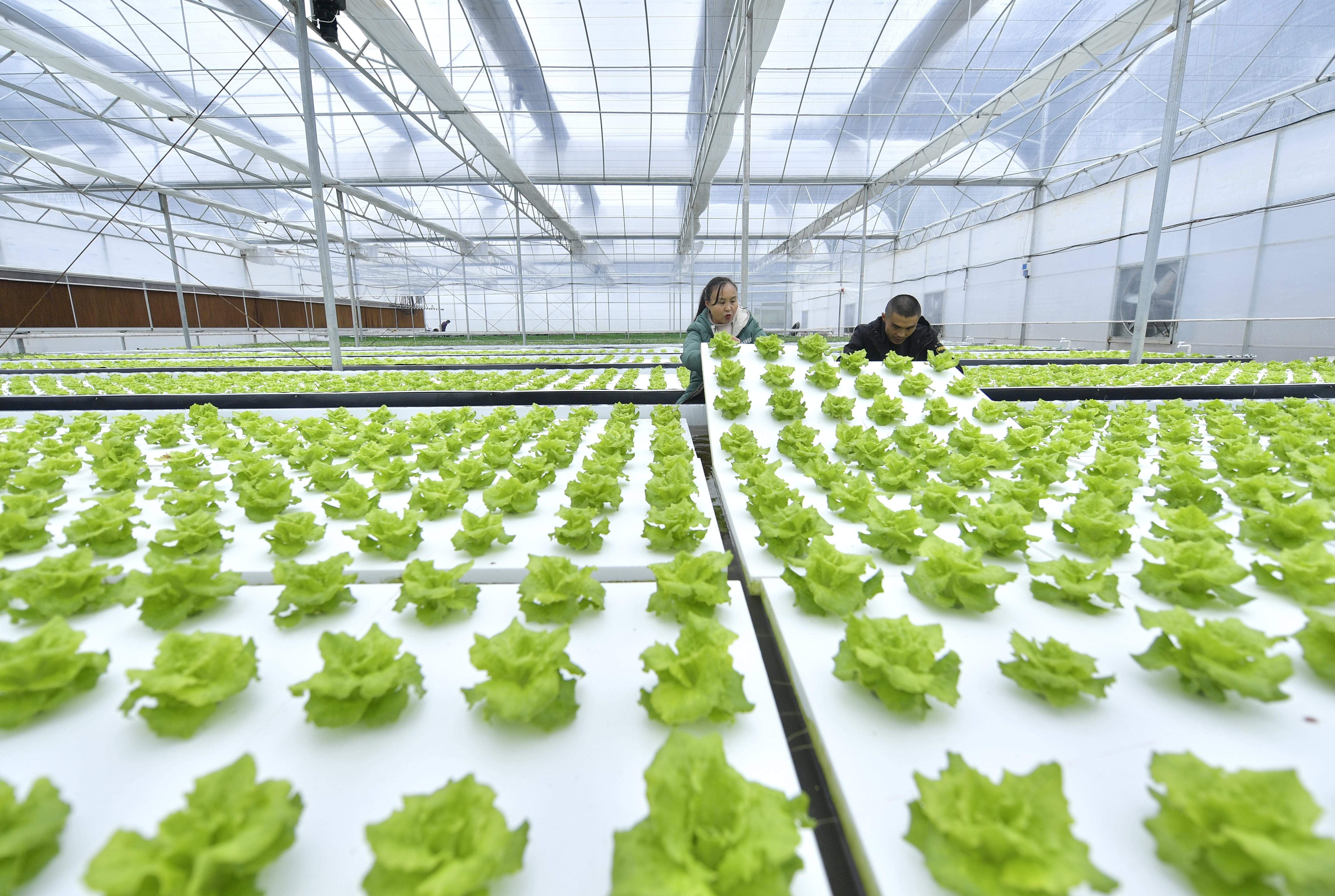 2022年11月29日,湖北省宣恩縣椒園鎮(zhèn)鑼圈巖村的農(nóng)民在溫控大棚里檢查水培蔬菜的生長情況。新華社發(fā)(宋文攝)