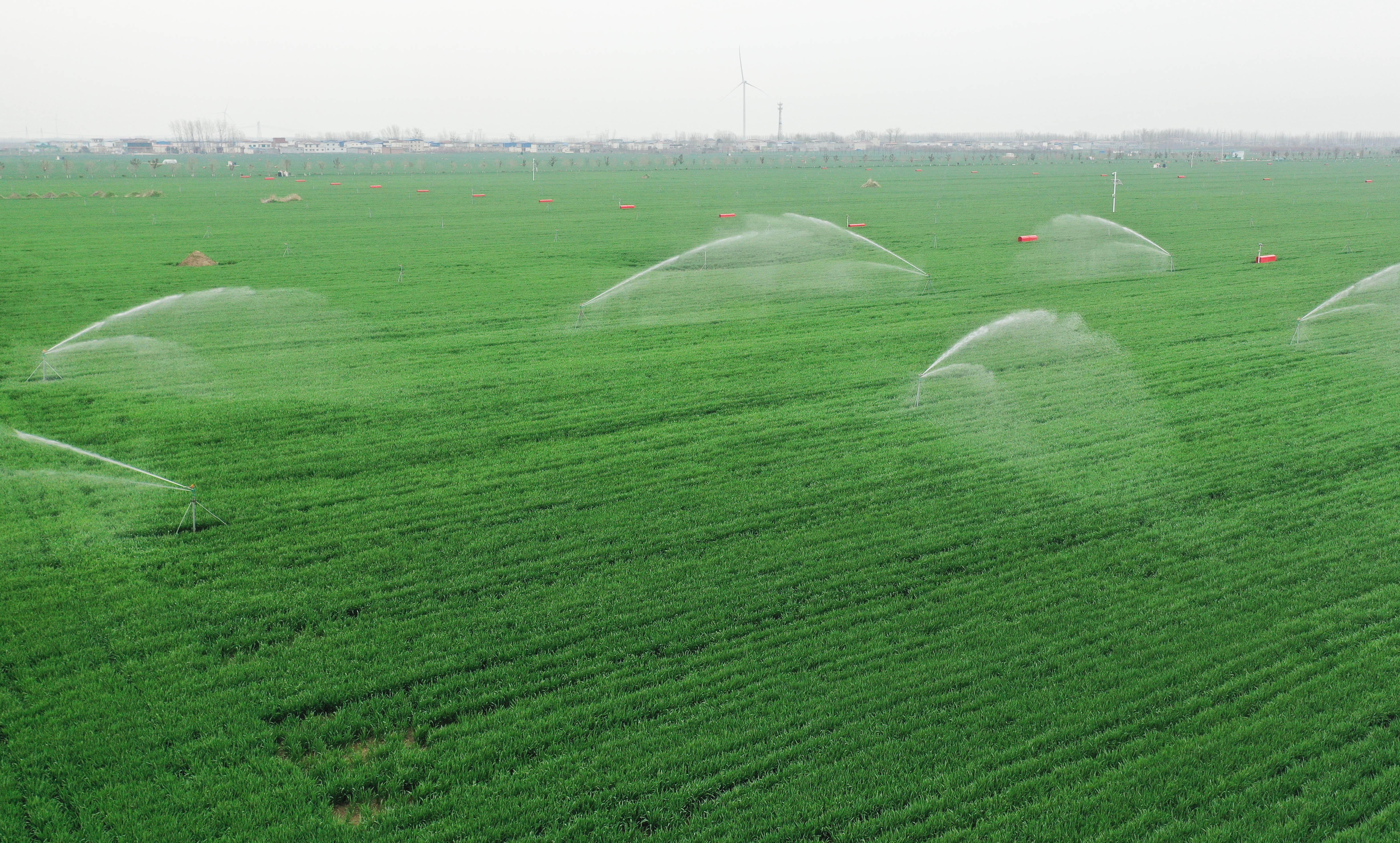 在河南省周口市商水縣張莊鄉(xiāng)高標準農(nóng)田示范區(qū),水肥一體機在為麥田澆灌(2022年3月22日攝,無人機照片)。新華社記者 張浩然 攝