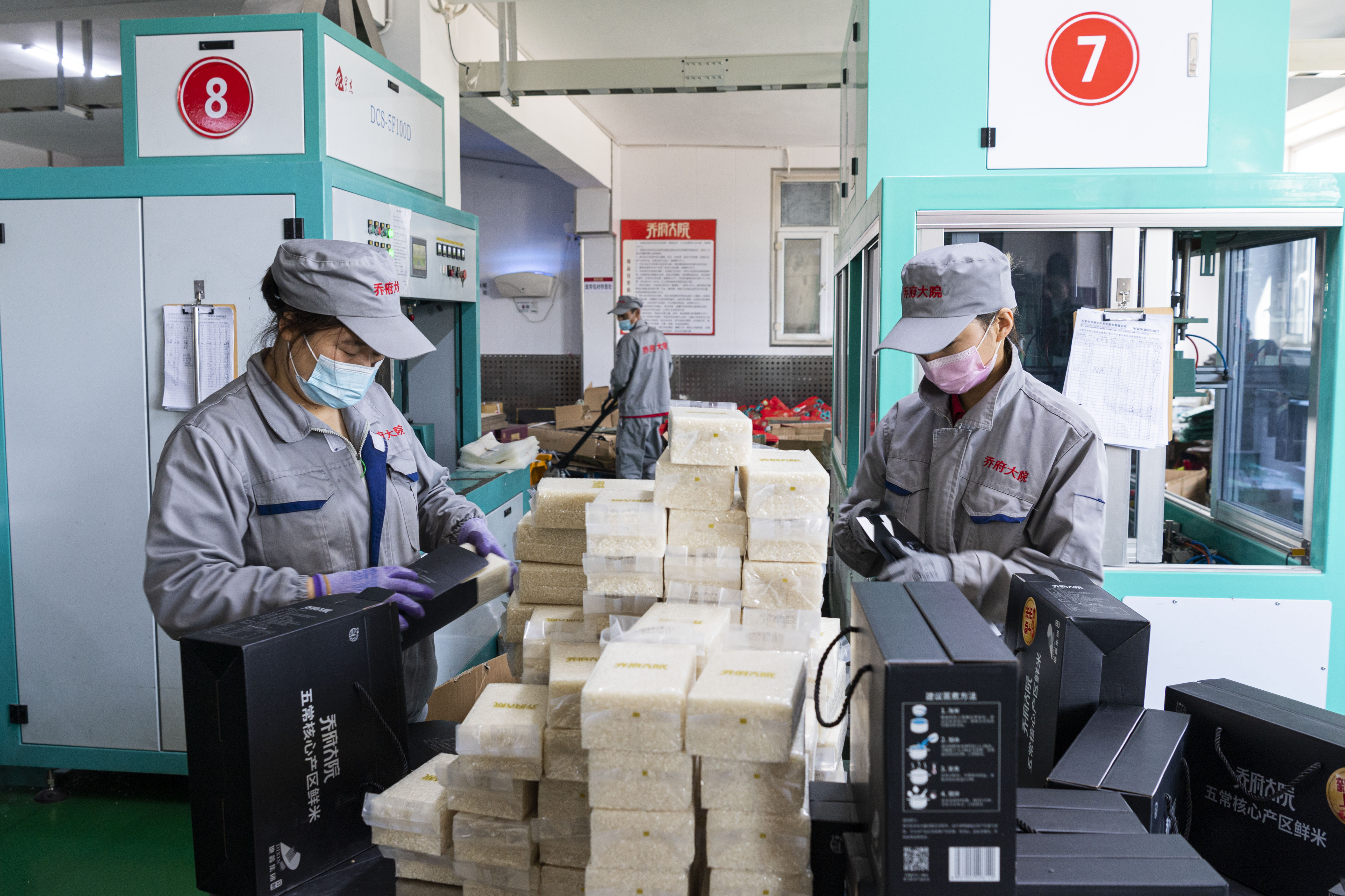 2022年11月2日,在黑龍江省五常市一大米加工企業(yè),工作人員在包裝大米。新華社記者 謝劍飛 攝