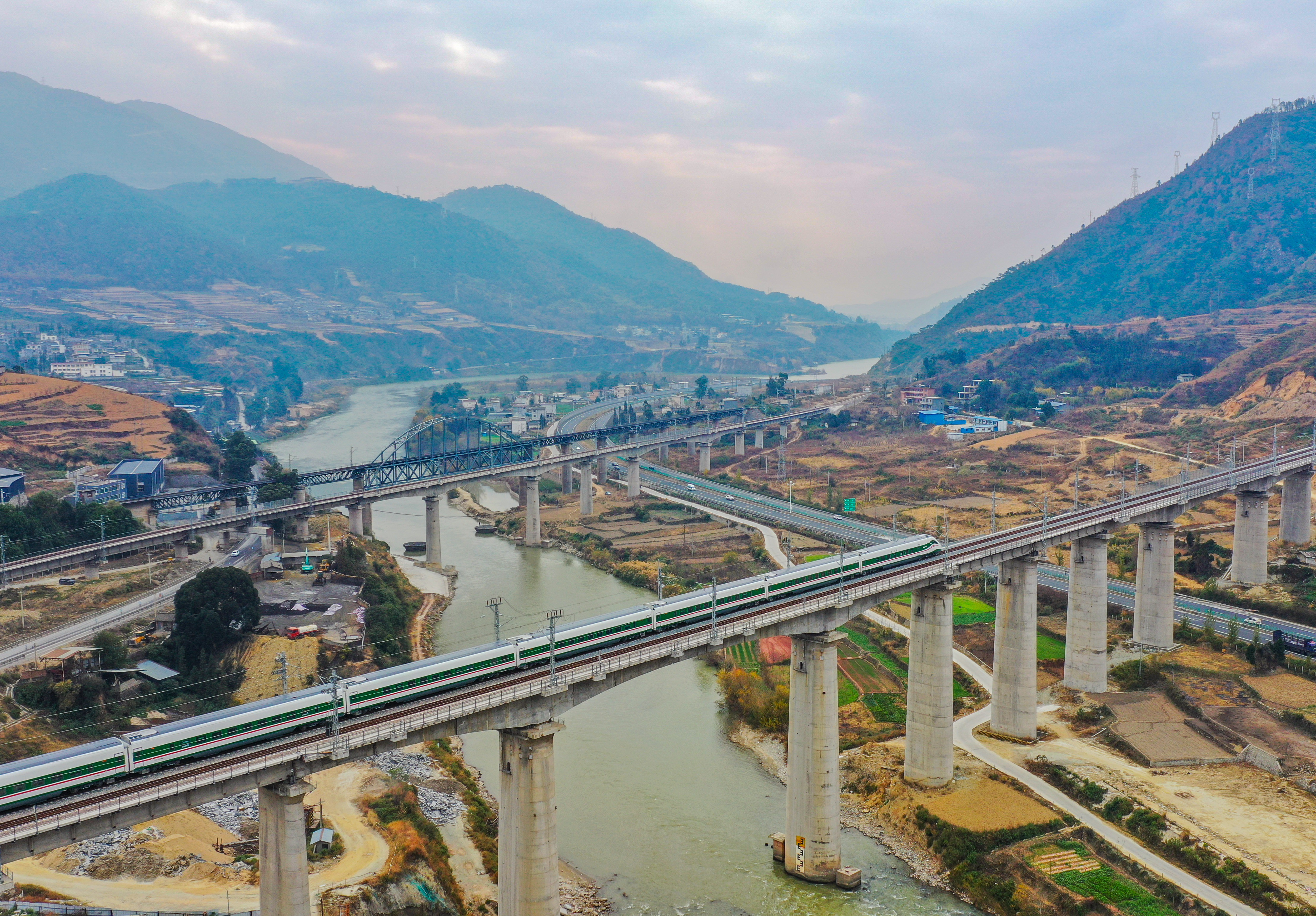 2022年12月24日,一列復興號動車組在四川省冕寧縣境內的新成昆鐵路進行開通運營前的試跑,遠處是老成昆鐵路(無人機照片)。新華社記者 王曦 攝